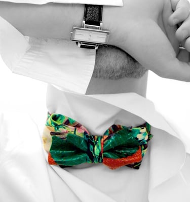 Besides the now iconic bow ties, the collection also includes other accessories based on our iconic bow design, fibre arts by renowned artist Danniel Oickle, and a custom workshop for unique haute couture and fibre arts restoration.